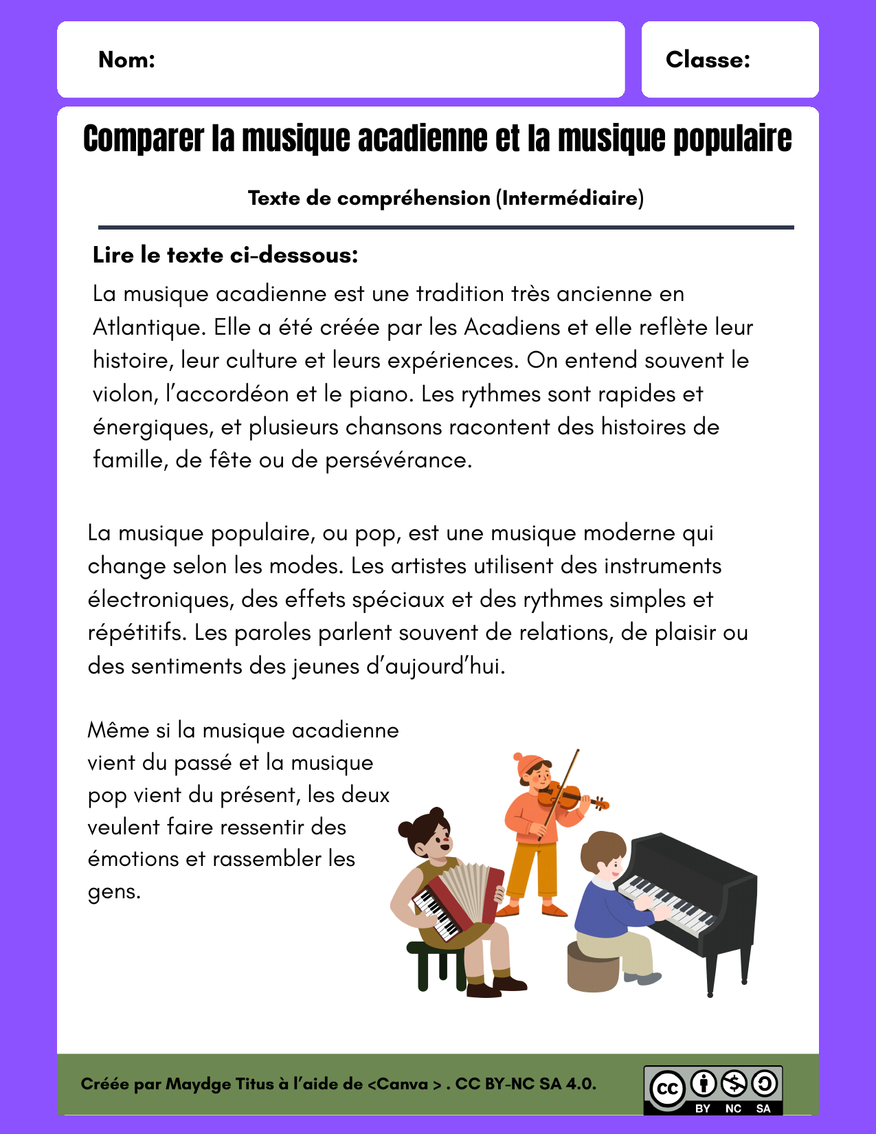 Textes de compréhension en français (débutant, intermédiaire, avancé) sur la musique acadienne et la musique populaire, suivis de questions pour comparer instruments, thèmes, différences et ressemblances.