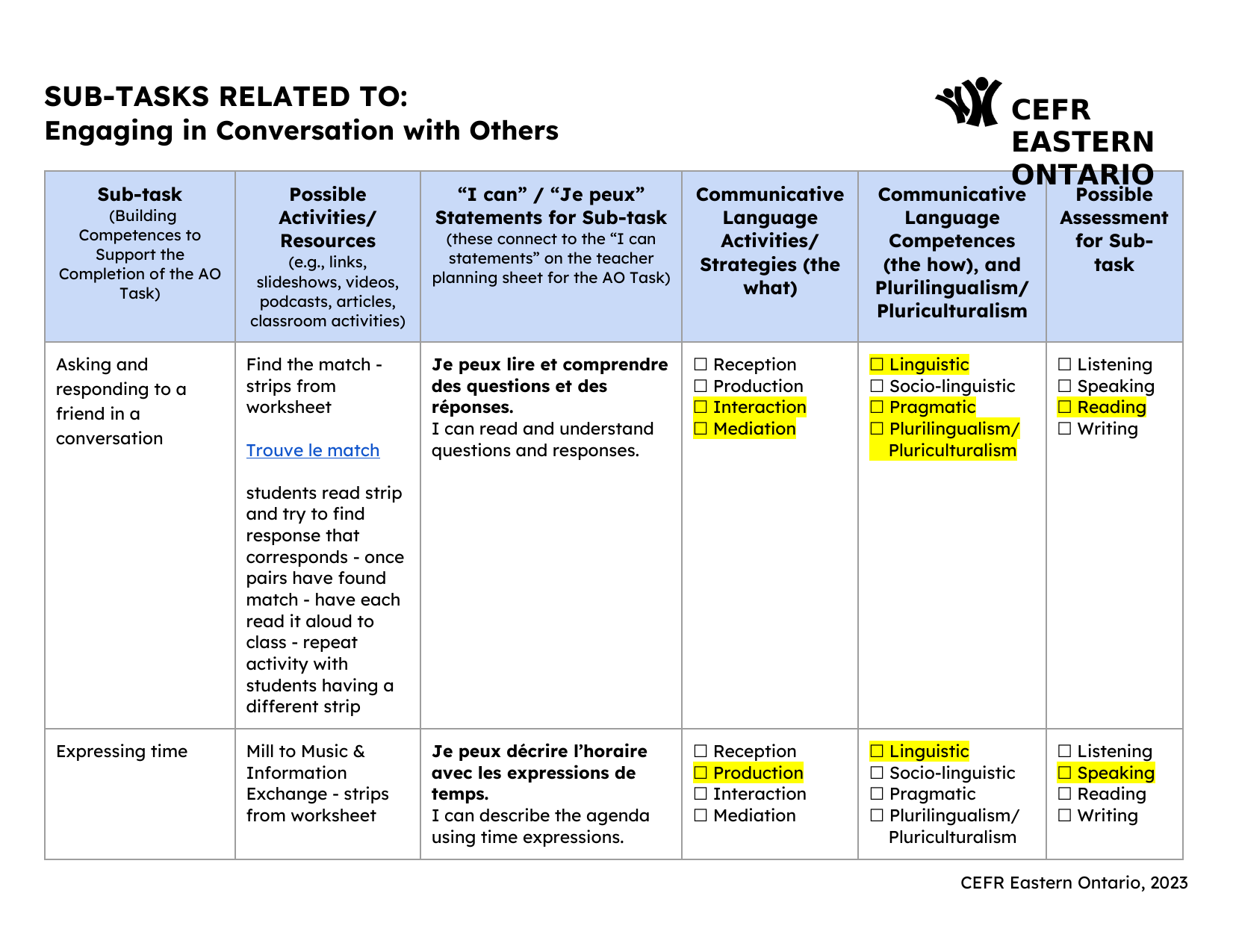 This document is a set of classroom sub-tasks to build students’ conversation skills in French, including matching question/response strips, a timed information-exchange activity using time expressions, and greeting/leave-taking practice with a happy/sad face prompt. Includes aligned “Je peux/I can” statements and links to communicative competences.