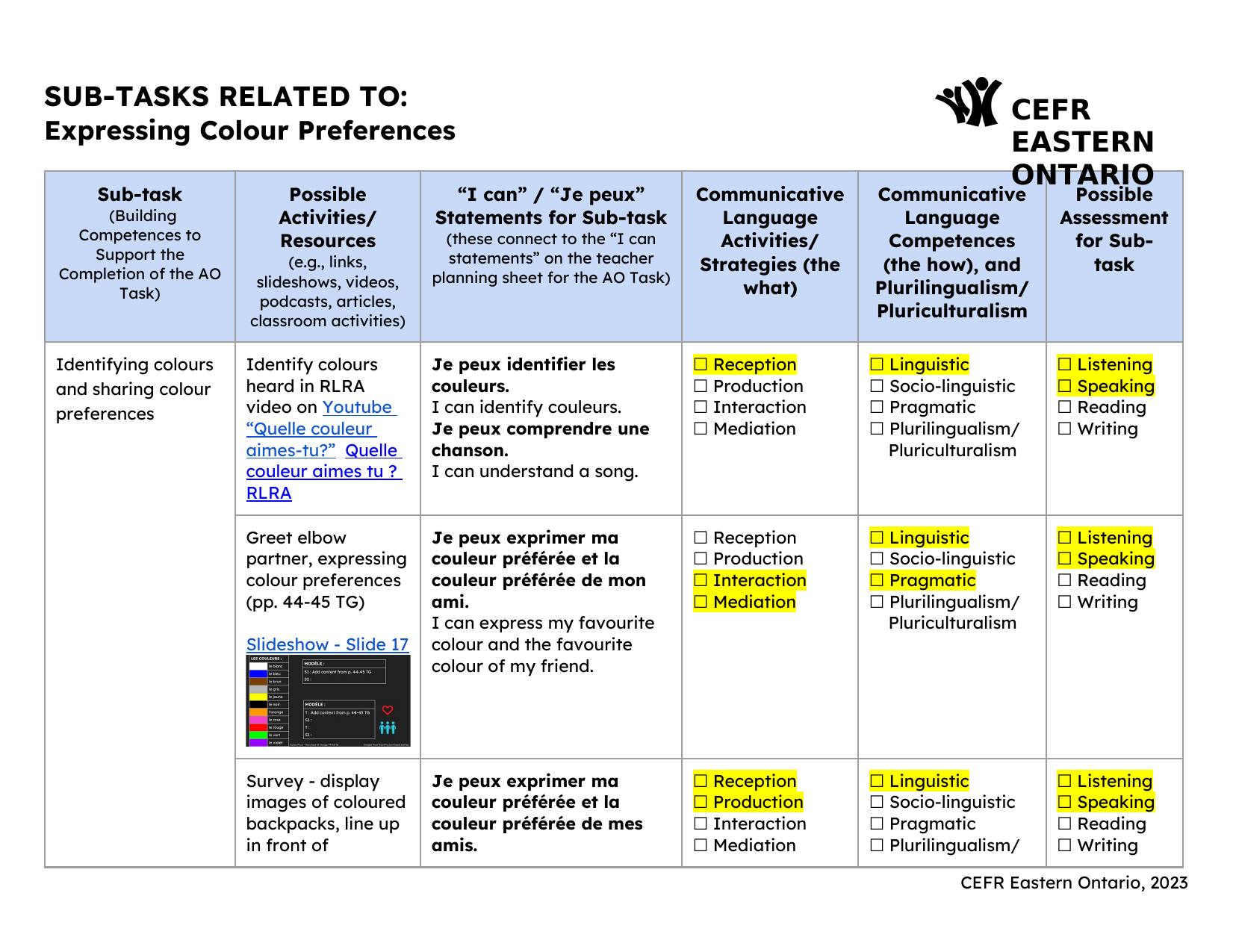 This document is a set of CEFR-aligned sub-tasks and suggested activities to help students identify colours, express favourite colours, discuss a story about a backpack, describe backpack colours, and build related vocabulary through listening and reading.