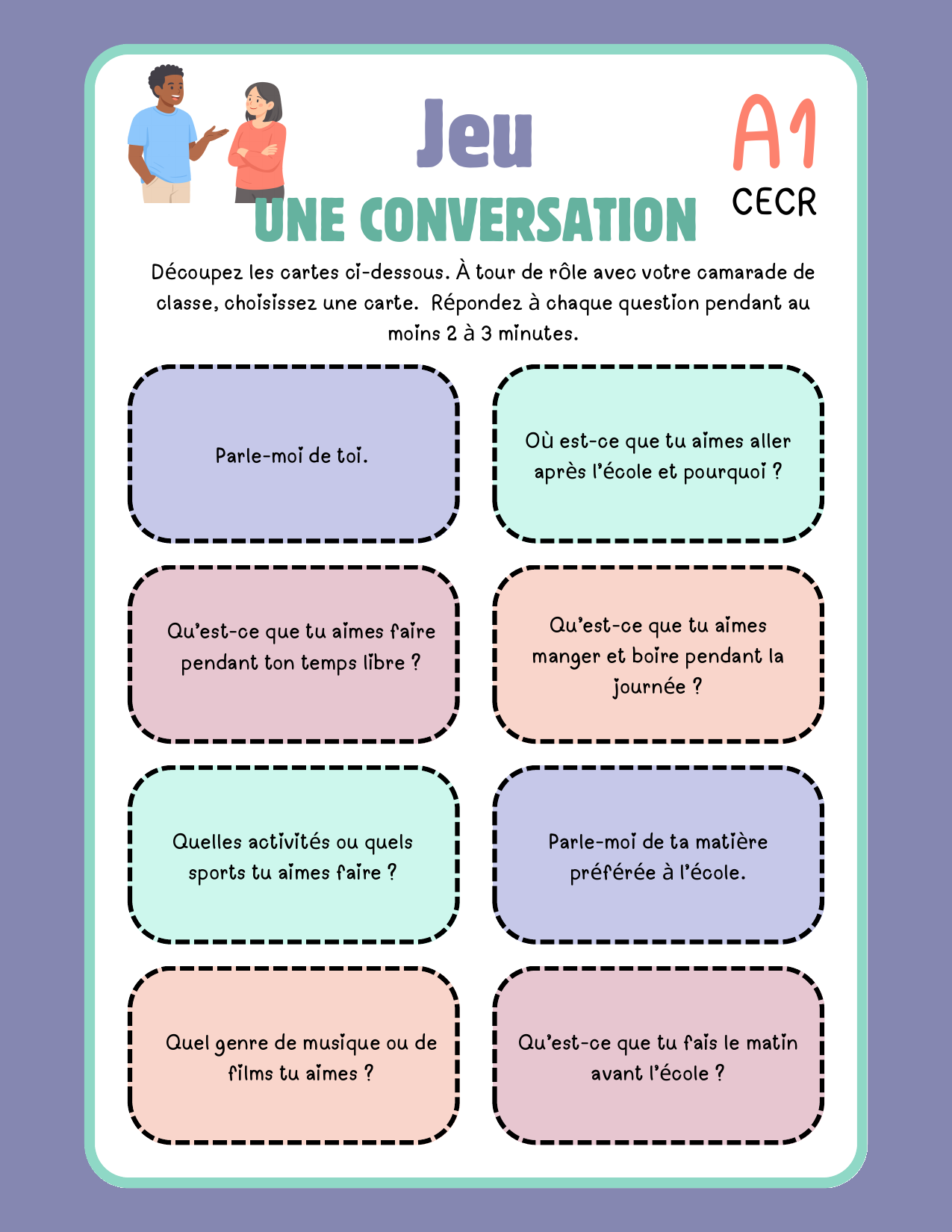 Cartes à découper pour travailler l’expression orale en binômes : les élèves choisissent une carte et répondent à des questions personnelles ou racontent des expériences pendant 2 à 3 minutes (niveaux A1 et A2 du CECR).