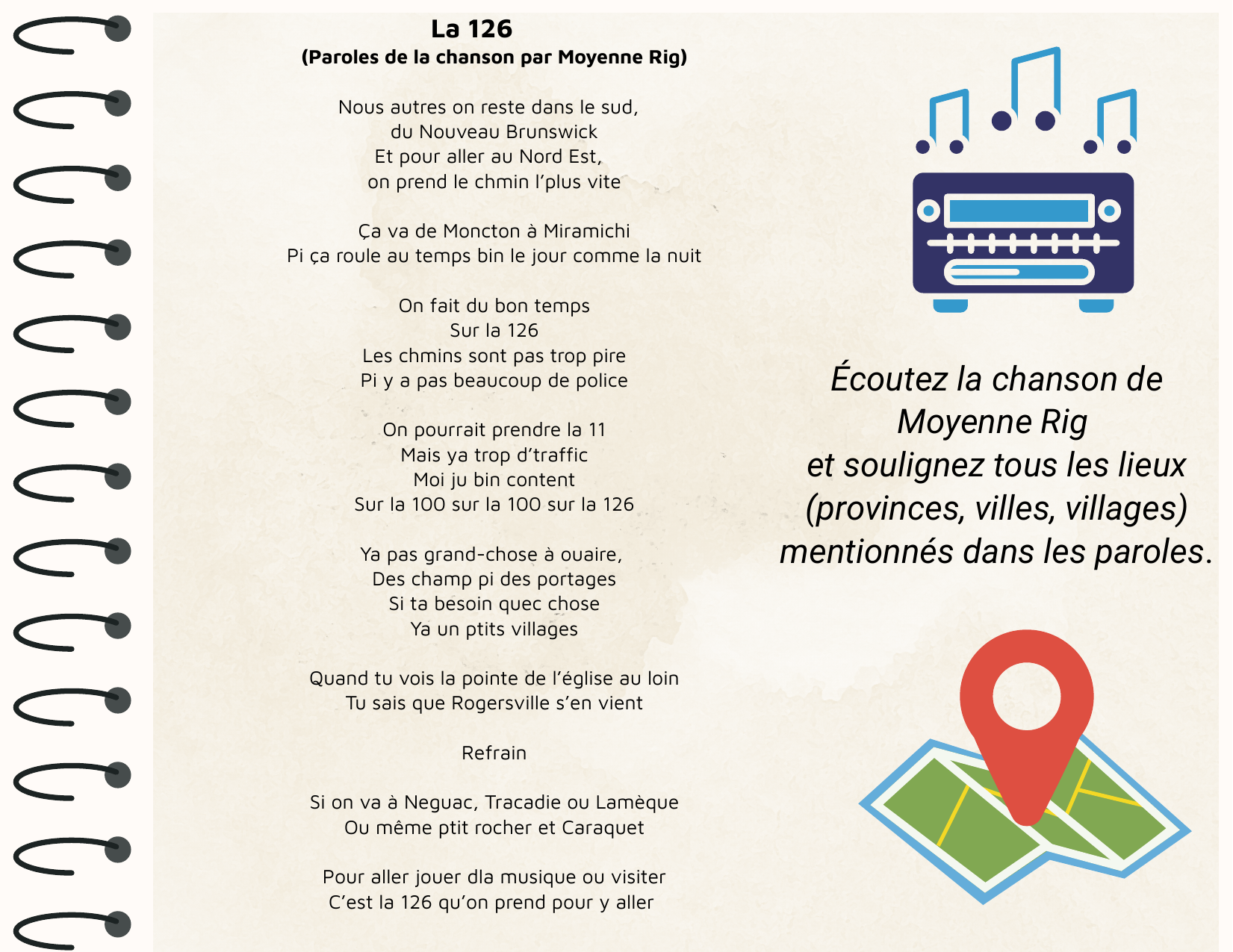 Students will listen to the song La 126 by Moyenne Rig and find locations that are mentioned in the song lyrics. They will then research highway 126 and reflect on where they would want to stop along that route on a roadtrip. They will then make an accompanying Acadian music playlist that they could listen to on their roadtrip.