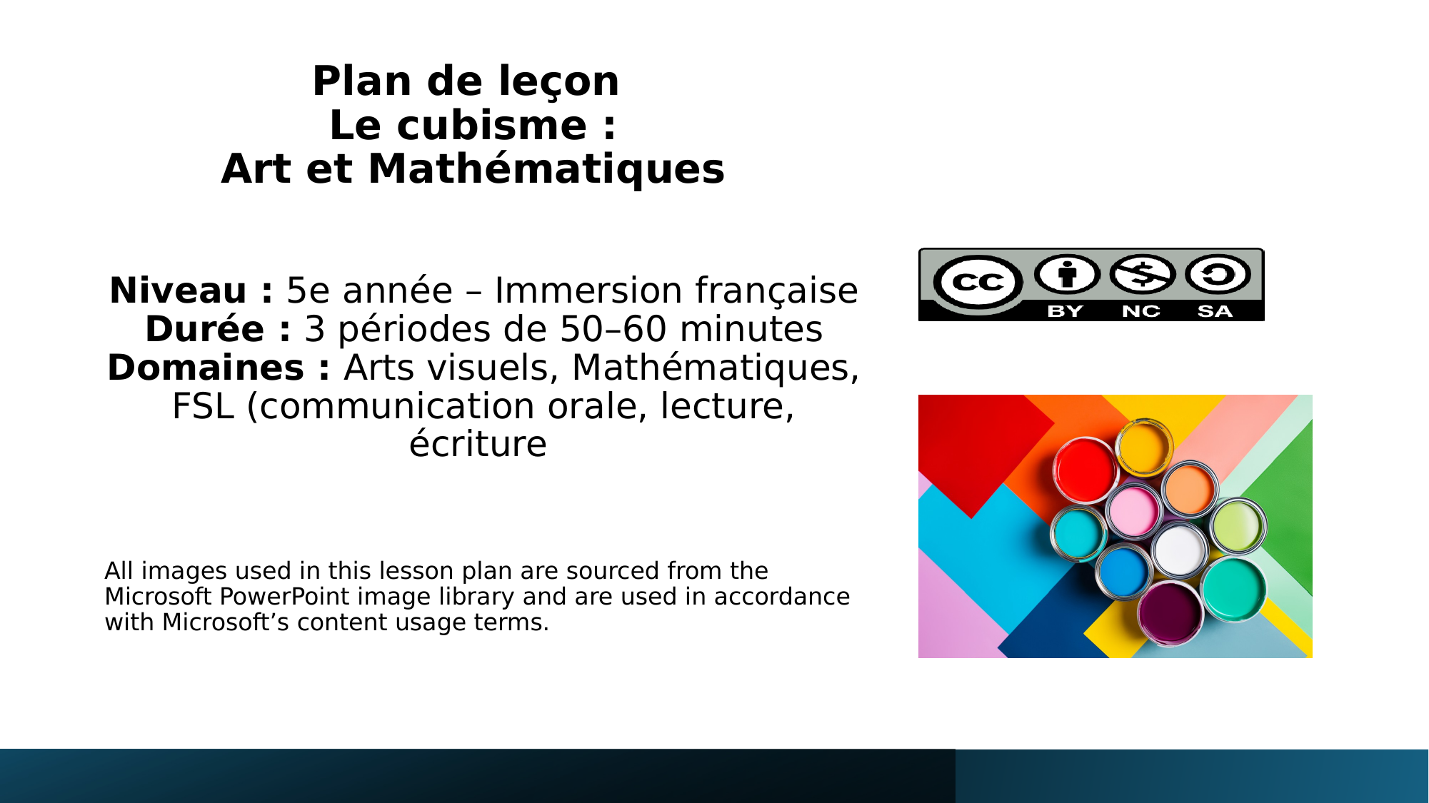 Plan de leçon en trois périodes liant arts visuels, géométrie et FLS. Les élèves découvrent les caractéristiques du cubisme, analysent des œuvres avec le vocabulaire des formes et transformations (rotation, translation, réflexion), puis créent une œuvre cubiste et la présentent oralement avec un court texte descriptif.
