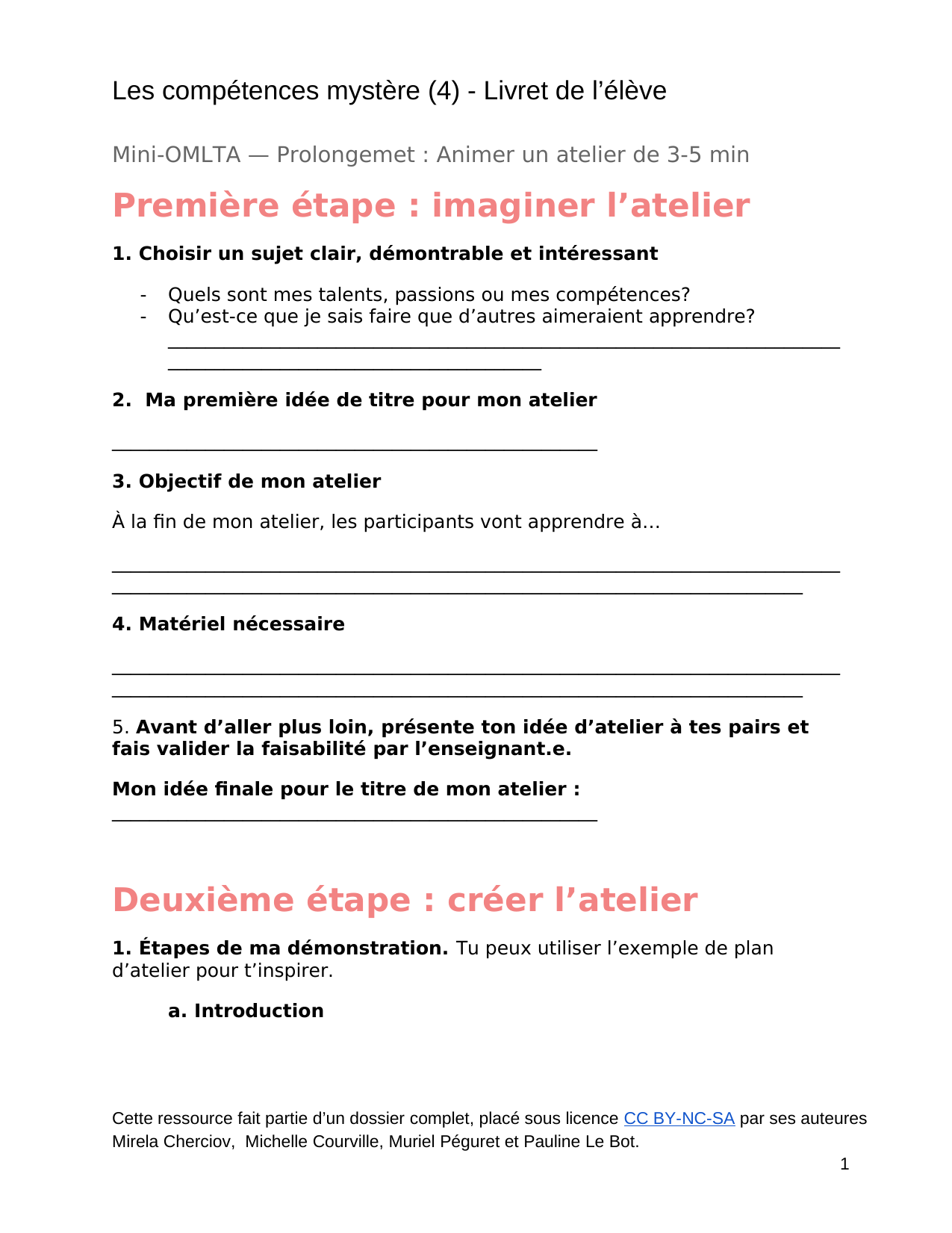 Le livret accompagne le prolongement possible présenté dans le Guide pour enseigner. La tâche consister à animer un atelier de 3-5 min dans le contexte d'une mini-conférence qui vise à développer de nouvelles compétences.