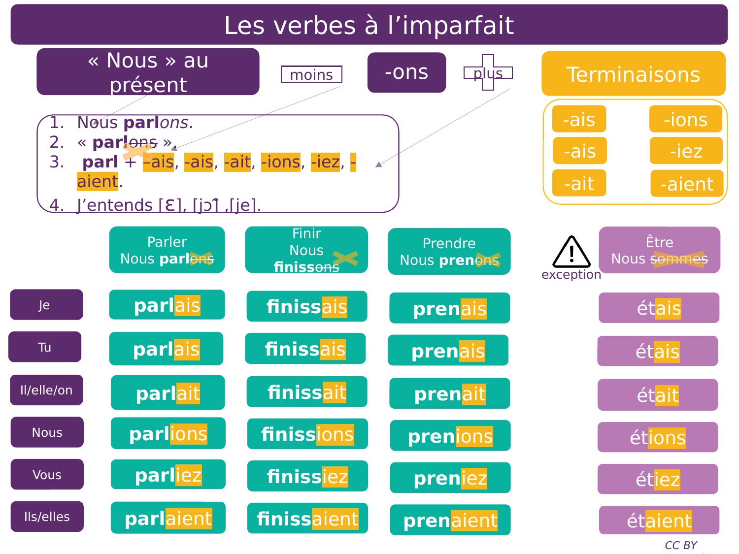 Fiche de référence expliquant comment former l’imparfait à partir de la forme « nous » au présent, avec les terminaisons (-ais, -ait, -ions, -iez, -aient) et des exemples (parler, finir, être, prendre).