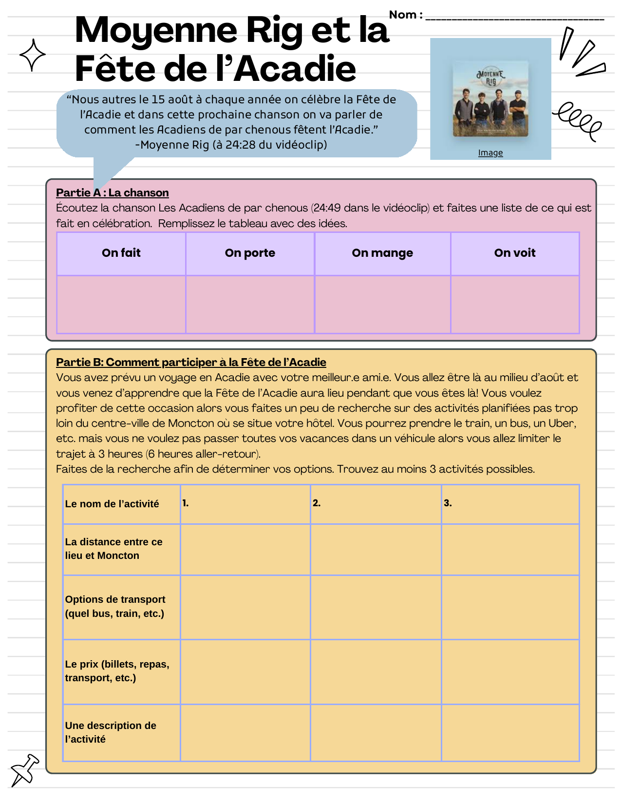 Les apprenants écoutent la chanson Les Acadiens de par chenous de Moyenne Rig qui mentionne la Fête de l'Acadie et discutent des paroles. Ils planifient ensuite un voyage dans la région afin de pouvoir participer à la Fête. Finalement, ils écrivent un courriel à un ami proposant l'itinéraire.