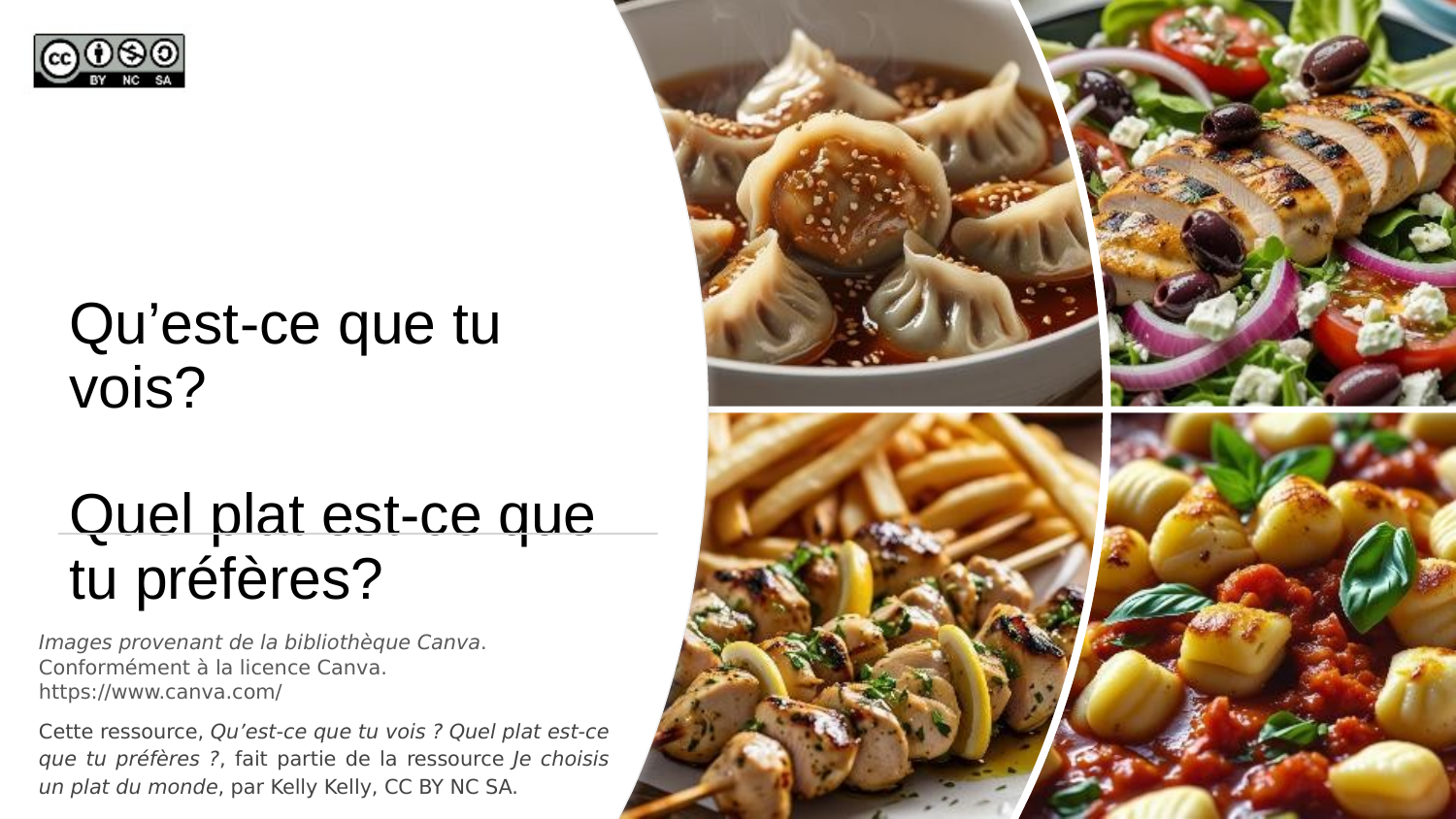 Il s'agit d'une présentation avec des photos de plats accompagnées de questions pour décrire les plats, nommer ses préférences alimentaires, etc.