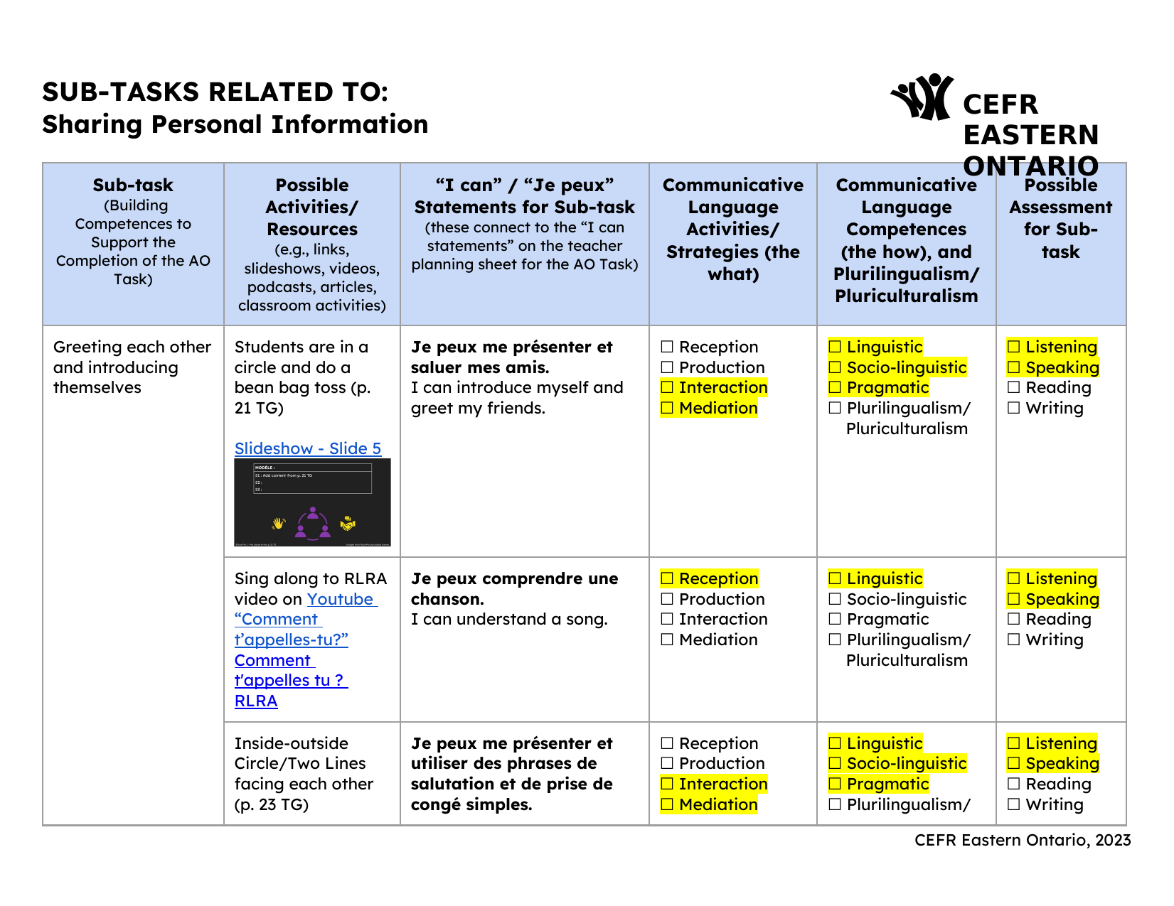 This document is a set of CEFR-aligned classroom sub-tasks and activities to help students share personal information in French, including greetings, introductions, stating age, short conversations, and reading a story with guided literacy strategies.