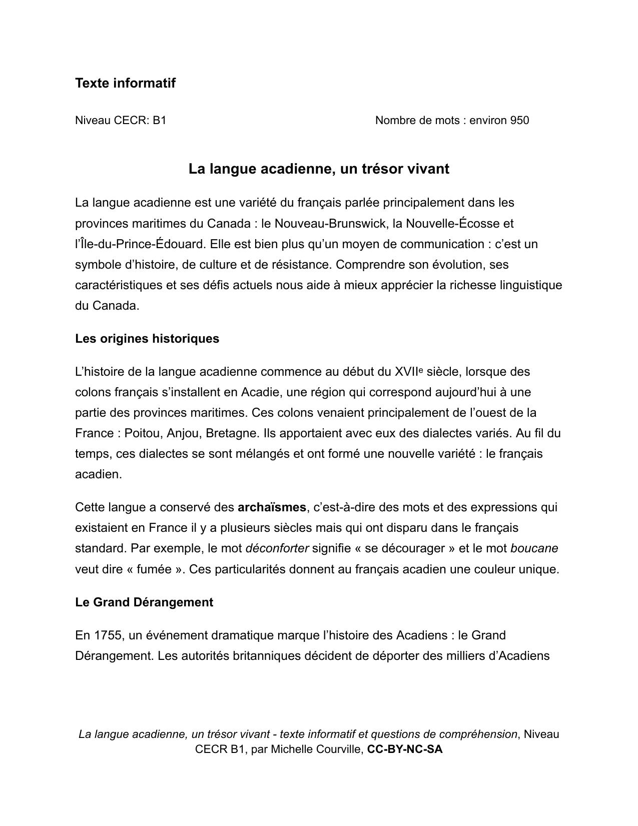 Ce module propose un texte informatif sur la langue acadienne et ses origines historiques, permettant aux élèves de découvrir et d’enrichir leur vocabulaire. Des questions de compréhension accompagnent le texte afin de soutenir la compréhension de l’écrit. Une activité finale invite les élèves à réaliser une courte rédaction sur l’importance de la langue et de la culture dans la construction de l’identité, suivie d’une discussion en petits groupes.