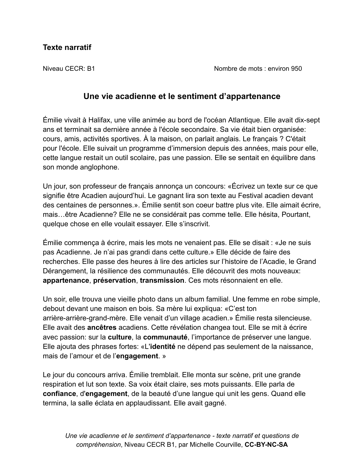 Cette ressource propose une courte histoire fictionnelle mettant en scène une petite fille, Émilie, et son rapport évolutif à la langue acadienne. Si son amour pour cette langue n’a pas toujours été présent, le récit explore un cheminement marqué par la fierté et le sentiment d’appartenance, contribuant au développement de l’identité acadienne. Le texte, de niveau B1, est accompagné de questions de compréhension, ainsi que d’activités d’expression écrite et orale à réaliser après la lecture.