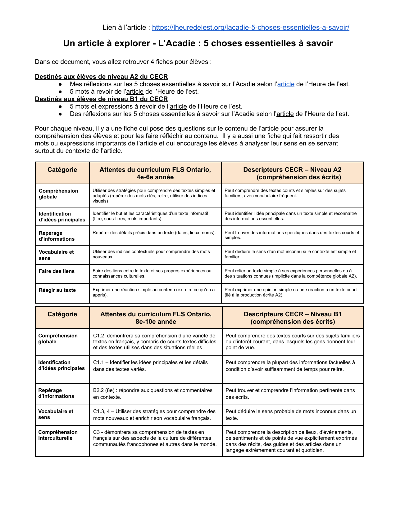 Un lien est fourni à un article en ligne sur 5 choses essentielles à savoir sur l'Acadie. Deux fiches élèves au niveau A2 et deux fiches au niveau B1 sont offertes qui explorent le vocabulaire pertinent de l'article et vérifie la compréhension du contenu.